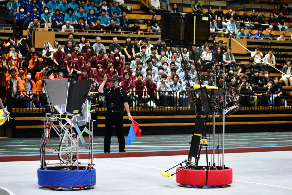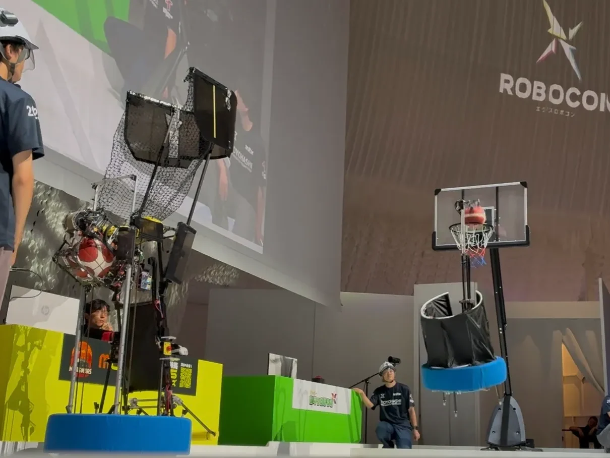 シュート対決を行うバスケットボールロボット「RC」は、昨年のNHK学生ロボコン2025で準優勝を果たしたロボットの1台であり、全高239cmという高さを生かしたディフェンスや、高精度の3ポイントシュートを得意としています。